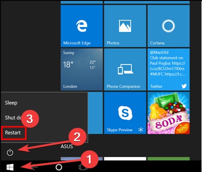 Nhấp vào menu Bắt đầu , nhấn biểu tượng Nguồn và giữ Shifttrong khi bạn chọn Khởi động lại .