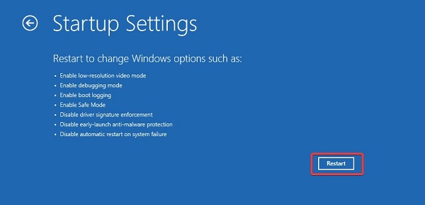 Trên màn hình Chọn một tùy chọn , chọn Khắc phục sự cố , điều hướng Tùy chọn nâng cao , Cài đặt khởi động và nhấp vào Khởi động lại .