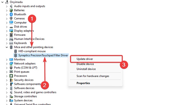 Mở rộng phần Mice and other pointing devices và các thiết bị trỏ khác , nhấp vào trình điều khiển bàn di chuột của bạn và chọn tùy chọn Update driver option .