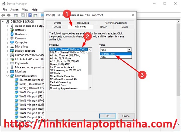 4. Chọn tùy chọn 802.11n Channel Width for 2.4GHz từ menu Thuộc tính và đặt Giá trị của nó thành chỉ 20Mhz .