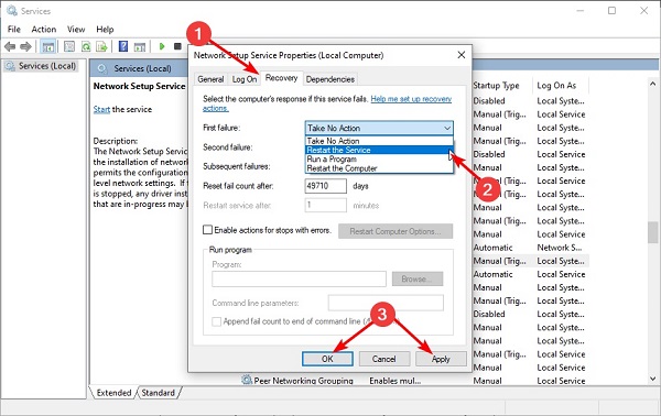 5. Nhấp vào menu thả xuống trước tùy chọn Lỗi đầu tiên và chọn Khởi động lại dịch vụ .