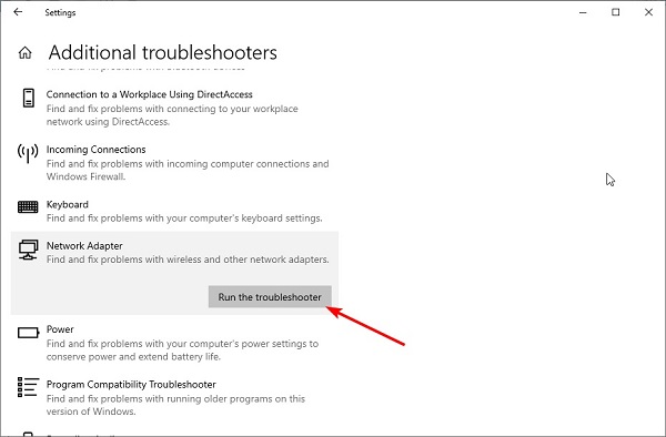 Bây giờ, chọn tùy chọn Bộ điều hợp mạng và nhấp vào Chạy trình khắc phục sự cố .