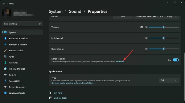 - Nhấp vào Advanced bên dưới Tăng cường âm thanh