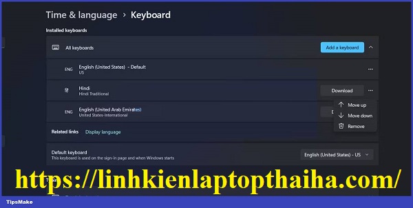 Bây giờ hãy nhấp vào ba dấu chấm ngang bên cạnh bàn phím trong danh sách. Để di chuyển bố cục bàn phím lên trong danh sách, hãy chọn nút Move up. Tương tự, nhấp vào nút Move down để di chuyển bố cục xuống một cấp trong danh sách.
