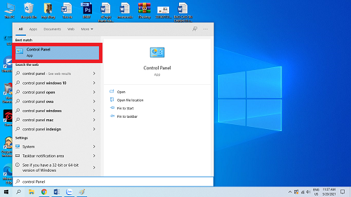 Bước 1: Tìm và chọn Control Panel trong hộp tìm kiếm trên Windows 10.