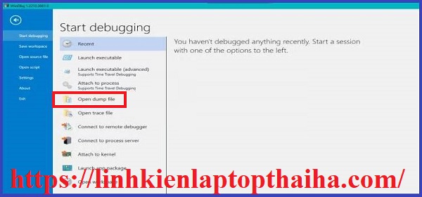 Khi bạn có tệp kết xuất, bạn có thể mở nó trong WinDBG. Để làm như vậy, hãy mở WinDBG, chọn File và nhấp vào Open Dump File.