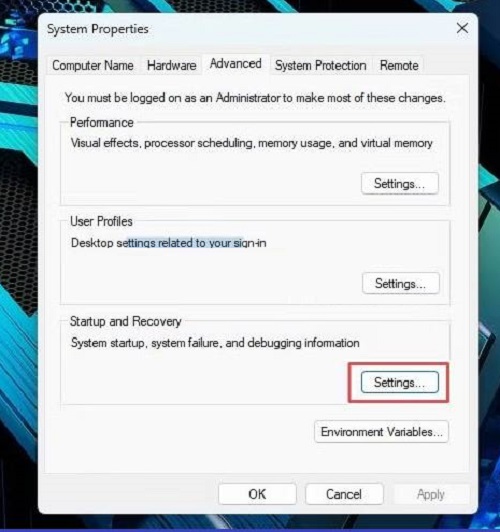 Để thực hiện việc này, nhấn phím Windows + R . Sau đó gõ sysdm.cpl và nhấn Enter để mở cửa sổ System Properties. Sau đó, bấm vào tab Nâng cao, rồi bấm vào nút Cài đặt trong phần Khởi động và Phục hồi.