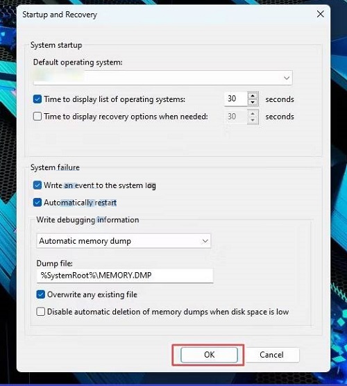 Trong cửa sổ Khởi động và Phục hồi, nhấp vào trình đơn thả xuống Ghi thông tin gỡ lỗi và chọn Kết xuất bộ nhớ hoàn chỉnh. Sau đó, chọn một thư mục để lưu các tệp kết xuất bộ nhớ và nhấp vào OK để xác nhận các thay đổi.