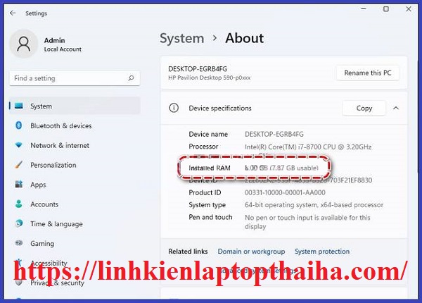 Bước 6: Khởi động lại máy tính và lỗi không nhận đủ RAM trên Windows 11 sẽ được khắc phục, bạn có thể click chuột phải vào My Computer (This PC) => chọn Properties. Xem thông tin RAM.