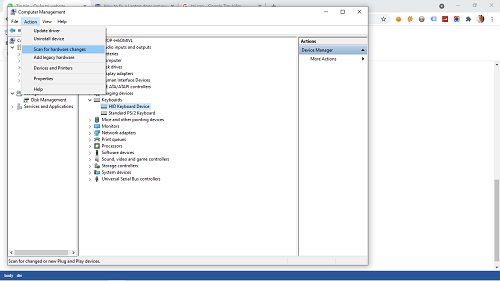 Bước 3: Sau đó, bạn chọn Hành động -> Quét thay đổi phần cứng để kích hoạt lại bàn phím trên Laptop.