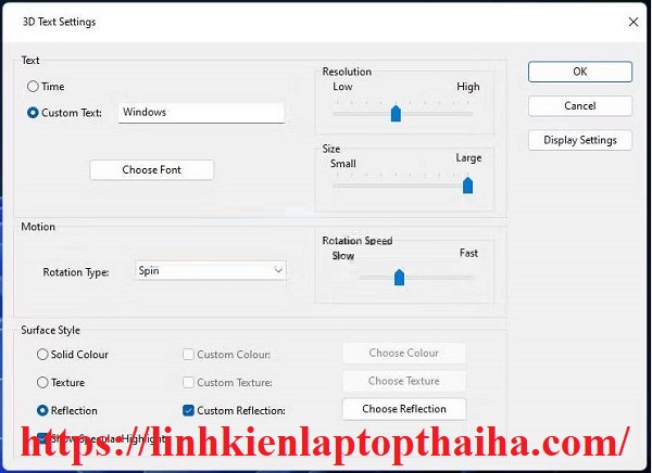 Nhấp vào Settings cho 3D Text sẽ hiển thị cửa sổ Cài đặt Văn bản 3D. Ở đó, bạn có thể thay đổi văn bản của trình bảo vệ màn hình bằng cách nhấp vào nút Văn bản tùy chỉnh và nhập một văn bản khác vào hộp. Hoặc bạn có thể chọn Thời gian để hiển thị đồng hồ kỹ thuật số 3D. Nhấn nút Phông chữ để chọn phông chữ và kiểu khác.