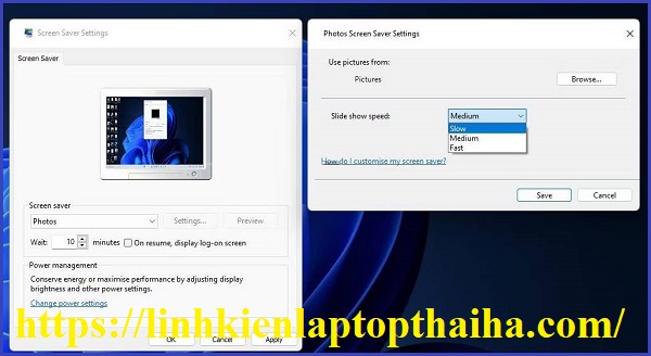 Nếu bạn chọn Ảnh bảo vệ màn hình, nhấp vào nút Cài đặt sẽ mở ra một cửa sổ mà từ đó bạn có thể thay đổi thư mục và tốc độ trình chiếu. Nhấp vào nút Duyệt trên cửa sổ đó để chọn một thư mục hình ảnh khác. Chọn tùy chọn Nhanh , Trung bình hoặc Chậm trên trình đơn thả xuống Tốc độ trình chiếu. Sau đó nhấp vào Lưu để áp dụng cài đặt.