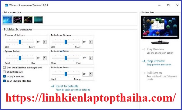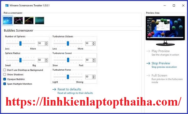 Bên dưới các thanh, có một số cài đặt hộp kiểm mà bạn bật hoặc tắt. Chọn Bong bóng mờ sẽ hiển thị bong bóng không trong suốt trong trình bảo vệ màn hình. Bạn có thể bỏ qua hình nền màn hình khỏi trình bảo vệ màn hình bằng cách chọn hộp kiểm Không sử dụng Màn hình nền làm Nền.