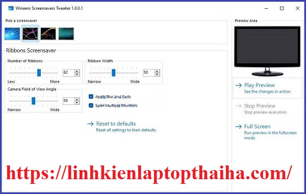 Bạn có thể chọn xem trước tất cả những thay đổi bạn thực hiện đối với trình bảo vệ màn hình trong phần mềm. Nhấp vào Play Preview để xem trình bảo vệ màn hình trong một màn hình thu nhỏ. Hoặc chọn Toàn màn hình để xem trình bảo vệ màn hình tùy chỉnh trông như thế nào ở chế độ toàn màn hình.