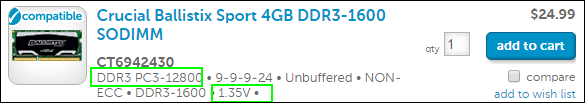 Khi mua RAM, hãy tìm hiểu xem đó là loại DDR2, DDR3 hoặc DDR4, cùng với điện áp và tốc độ của nó. Hầu hết các máy tính xách tay thời đại gần đây đều sử dụng RAM DDR3 có tốc độ PC3-12800 và 1,5 hoặc 1,35 volt. Nhìn qua các danh sách RAM, bạn cũng có thể thấy các thông số kỹ thuật cho biết đó là ECC hay không ECC và được đệm hay không có bộ đệm. Ngoại trừ một vài máy trạm cao cấp, hầu hết các máy tính xách tay đều sử dụng bộ nhớ không ECC, bộ nhớ đệm.
