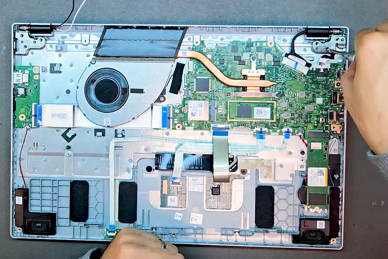 Bước 7: Tiếp tục tháo 2 đầu cáp còn lại cùng cáp màn hình gắn vào bo mạch chủ và tháo quạt tản nhiệt ra.