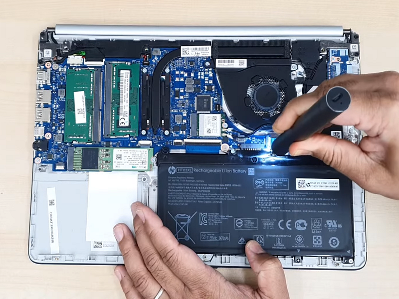 Bước 4: Sau khi tháo mặt dưới laptop ra, tiến hành tháo cáp pin ra khỏi bo mạch chủ