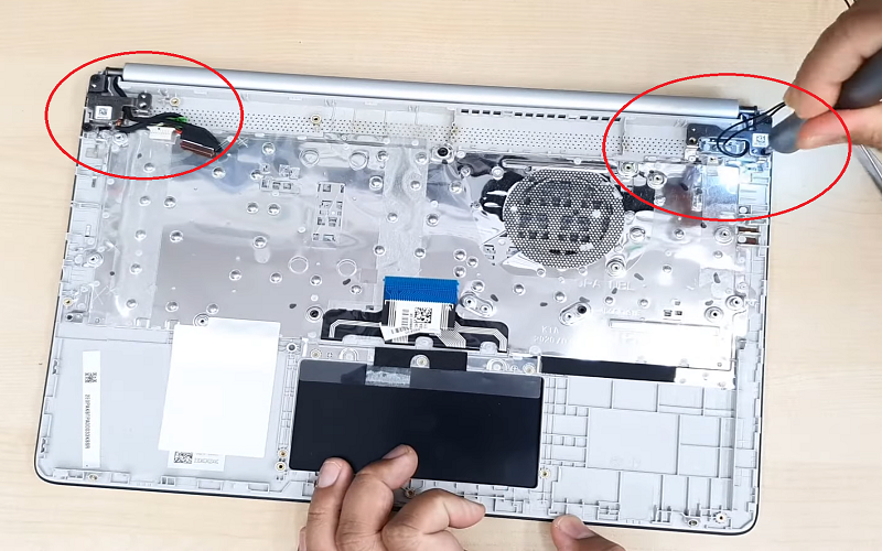 Bước 8: Tiếp theo tháo các ốc bản lền gắn cụm màn hình với laptop rồi tháo cụm màn hình ra ngoài.