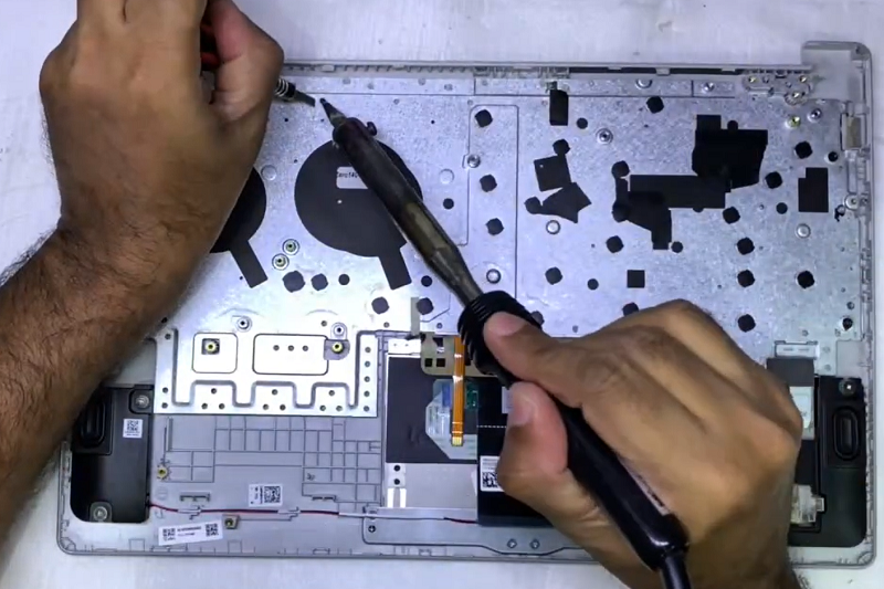 Bước 6: Dùng mũi hàn để loại bỏ các nốt hàn và gỡ tấm kim loại phía trên bàn phím ra ngoài.