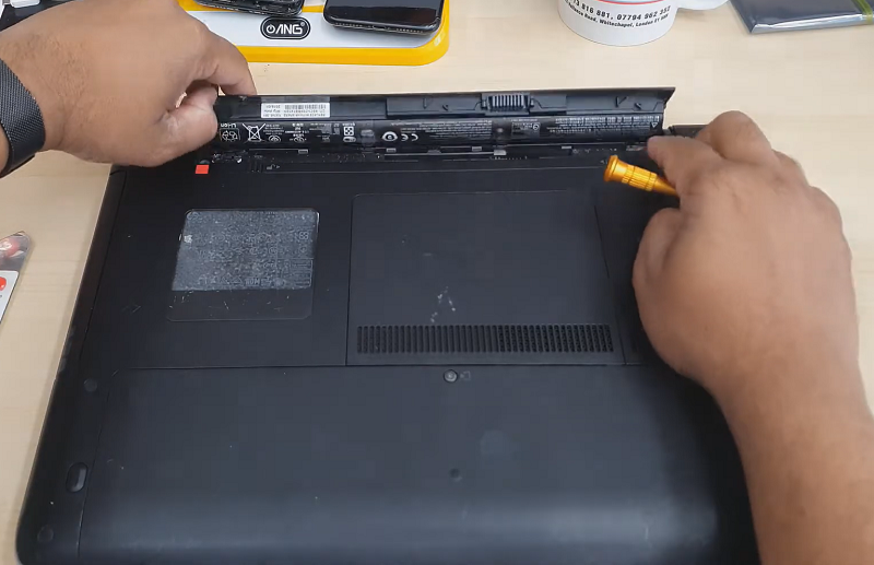 Bước 1: Tắt laptop rồi lật mặt dưới laptop lên và tháo viên pin laptop ra ngoài.