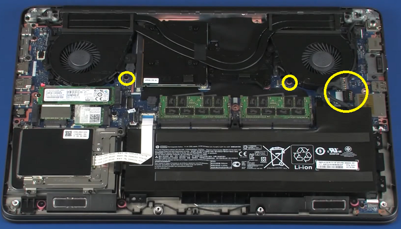 Bước 1: Tắt laptop rồi lật mặt dưới laptop lên gỡ mặt dưới laptop ra và tháo 2 con ốc ở vị trí đánh dấu trên ảnh và cáp pin laptop ra ngoài.