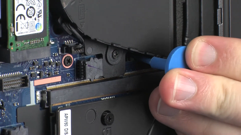Bước 2: Tại vị trí cạnh quạt tản nhiệt như trên ảnh dùng dụng cụ ấn nhẹ vào để đẩy chốt bàn phím laptop lên.