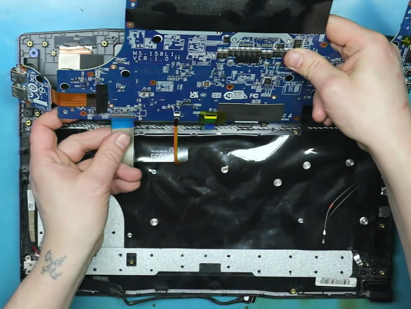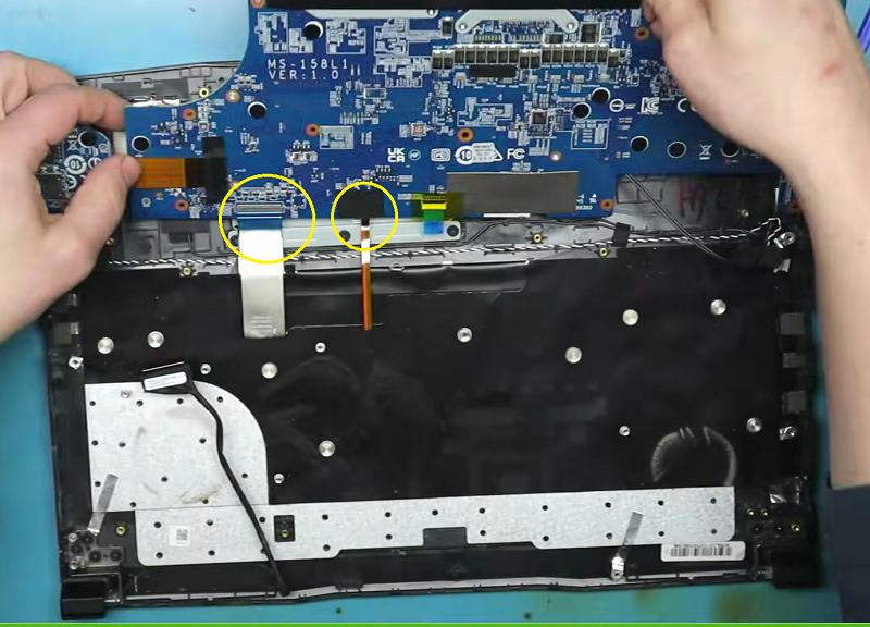 Bước 4: Nhẹ nhàng ngửa bo mạch chủ lên và tháo các đầu cáp bàn phím đang gắn vào bo mạch chủ.