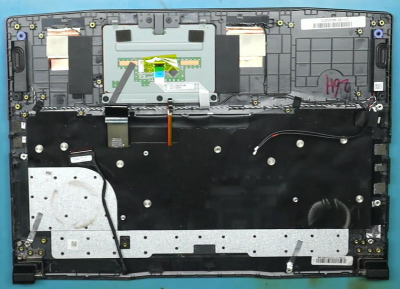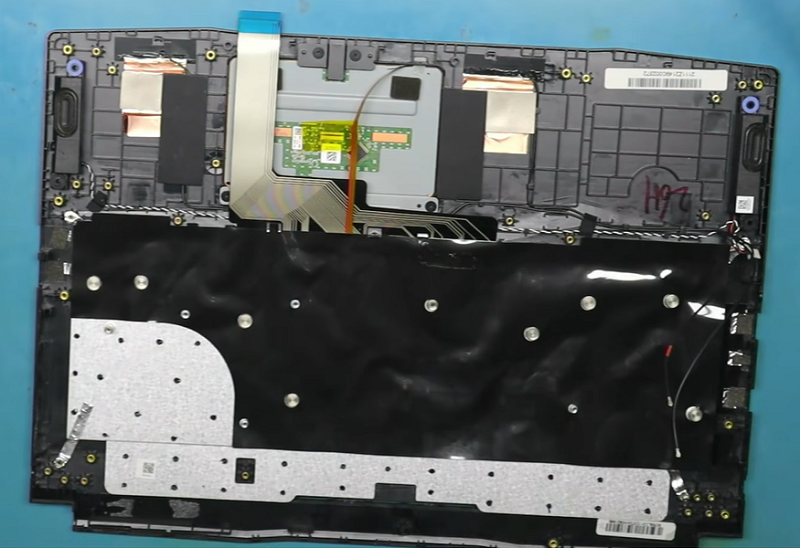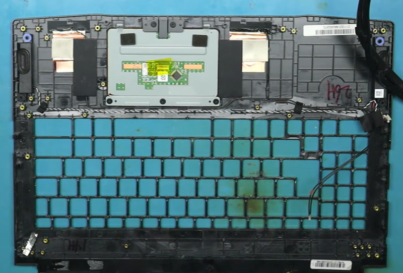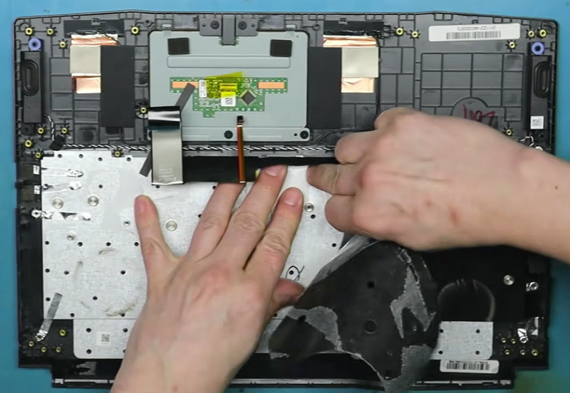 Bước 6: Tiếp đến là cần tháo lớp băng dính đen cách điện phía trên bàn phím sẽ thấy tấm kim loại được hàn chặt để cố định bàn phím.
