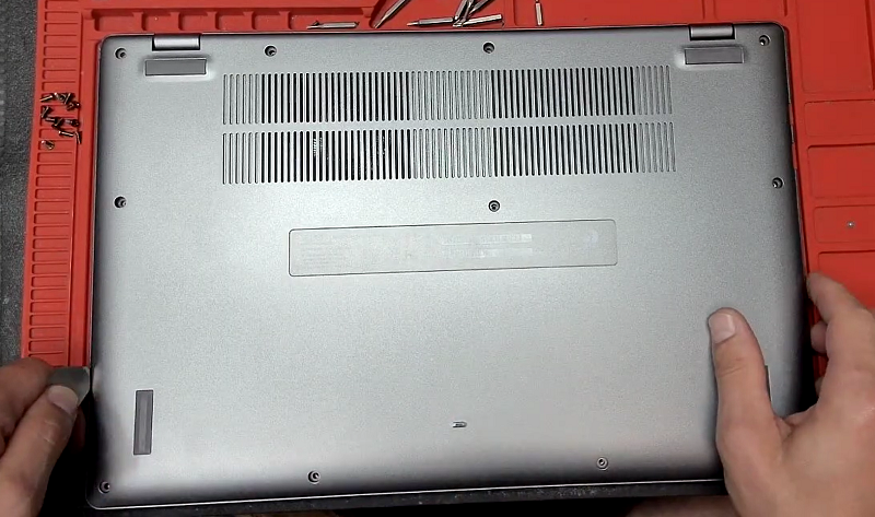 Bước 1: Đầu tiên sẽ cần tắt laptop và úp laptop xuống hướng mặt dưới lên trên rồi dùng tua vít tháo hết tất cả các con ốc cố định mắt dưới ra ngoài.
