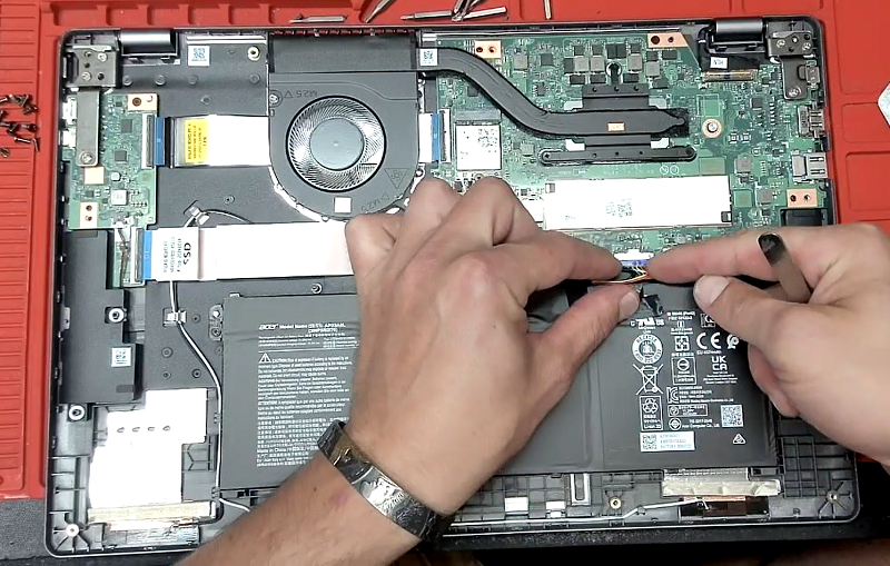Bước 3: Tháo mắt dưới laptop ra, tại vị trí pin laptop tiến hành tháo cáp pin ra khỏi bo mạch chủ để tránh cháy chập khi thao tác thay màn hình.