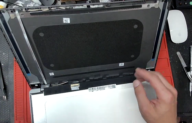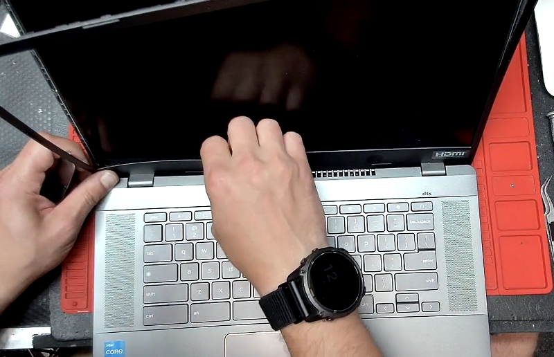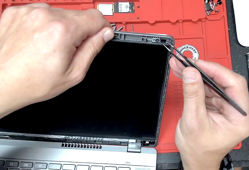 Bước 5: Sau khi tháo được tấm nhựa bảo vệ phía trước màn hình, tại vị trí trên 2 góc sử dụng nhíp để kéo 2 dải siu dán màn hình ra là màn hình sẽ tự động tách ra khỏi laptop.