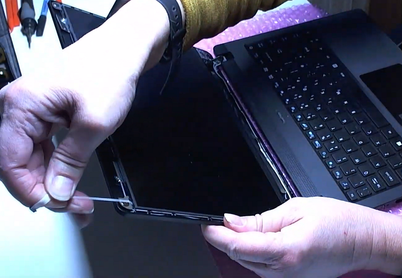 Bước 2: Tiến hành dùng dụng cụ để tháo tấm nhựa bảo vệ phía trước của màn hình laptop.