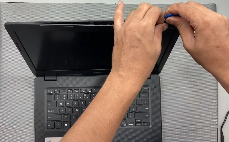 Bước 2: Dùng dụng cụ cậy mở và khéo léo cậy tấm nhựa bảo vệ màn hình ra khỏi mặt trước laptop