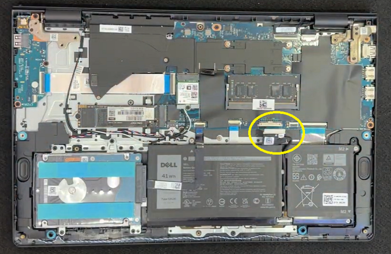 Bước 2: Cần tháo cáp pin đang gắn với bo mạch chủ ra đầu tiên để tránh chập cháy khi tiến hành thay màn hình laptop.