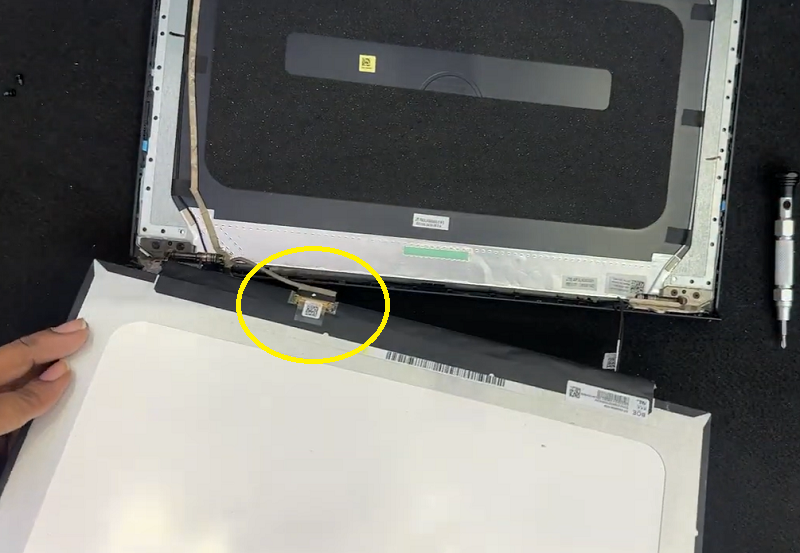 Bước 7: Khi hạ màn hình xuống ta tiếp tục tháo đầu cáp đang gắn với màn hình.