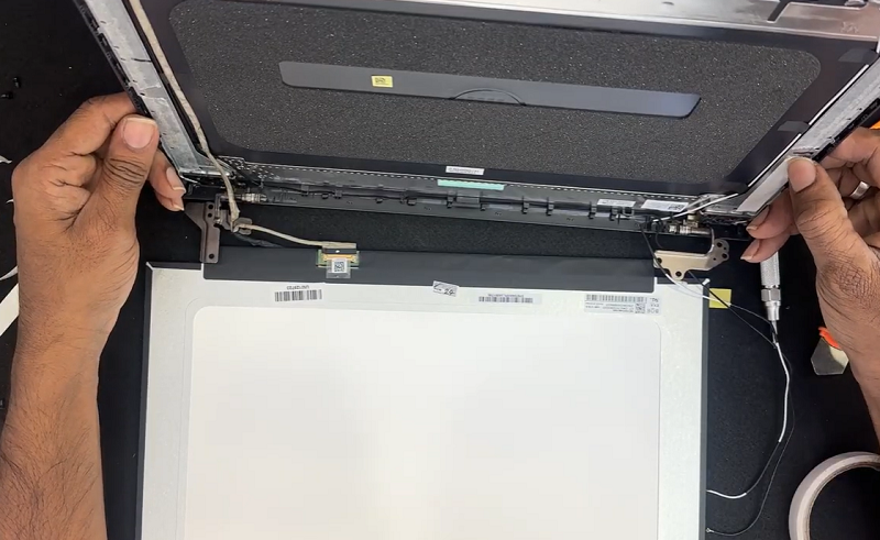 Bước 10: Gắn lại màn hình vào vị trí sau đó lắp tấm nhựa bảo vệ mặt trước và 2 miếng nhựa bảo vệ bản lề lúc trước tháo ra.