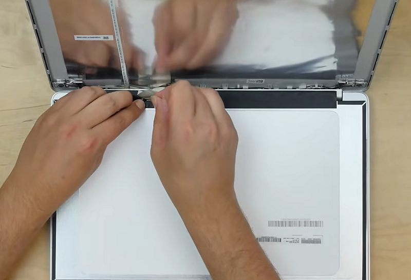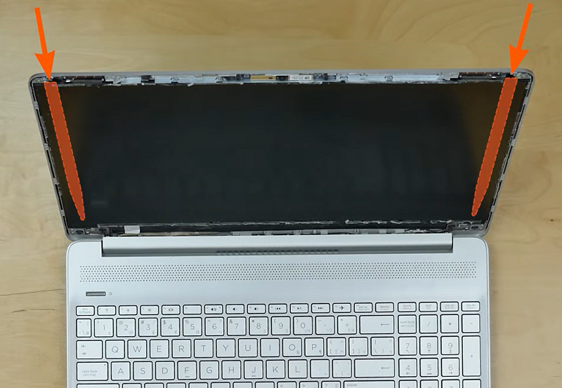 Bước 3: Nhẹ nhàng kéo 2 dải siu dán màn hình ra khỏi laptop.