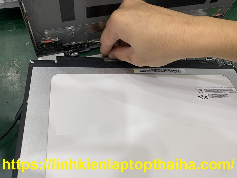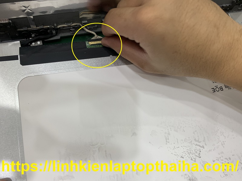 Bước 8: Nhẹ nhàng gỡ màn hình đã lỗi hỏng ra khỏi mặt B, lưu ý màn hình vẫn còn gắn với laptop bởi cáp màn hình nên cần nhẹ tay. Tháo cáp màn hình đang gắn với màn hình ra và gỡ màn hình bị hư hỏng.