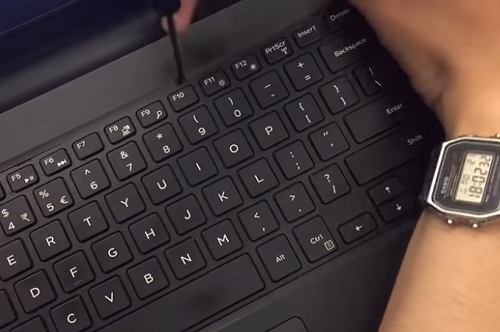Bước 3: Lật lại laptop và sử dụng nhíp để cạy các lẫy xung quang bàn phím laptop, với dòng laptop Dell Vostro 3567, 15 3000 series này chúng ta không phải tháo ốc mà bàn phím được cố định bởi các lẫy xung quang bàn phím