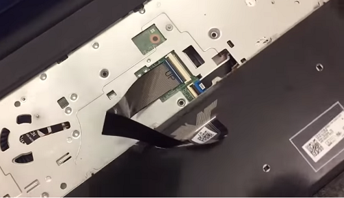 Bước 4: Lật bàn phím cũ lên và nhẹ nhàng đẩy lẫy giữ cáp bàn phím và laptop lên 1 góc 90 độ rồi kéo cáp bàn phím ra ngoài là ta đã hoàn toàn tháo được bàn phím ra khỏi laptop