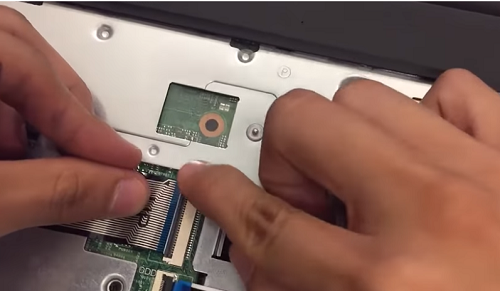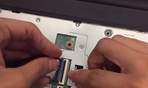 Bước 5: Lấy bàn phím mới đã chuẩn bị sẵn và cắm cáp màn hình gắn vào laptop rồi đóng lẫy giữ cáp lại, sau đó chúng ta gắn lại các lẫy xung quanh sao cho ăn khớp với bàn phím mới, kiểm tra các phím bấm có bị kiêng hay bấm bị cộm lên không, có bị lệch so với ban đầu không, nếu không có dấu hiệu gì bất thường là bạn đã thay thành công 50% bàn phím mới