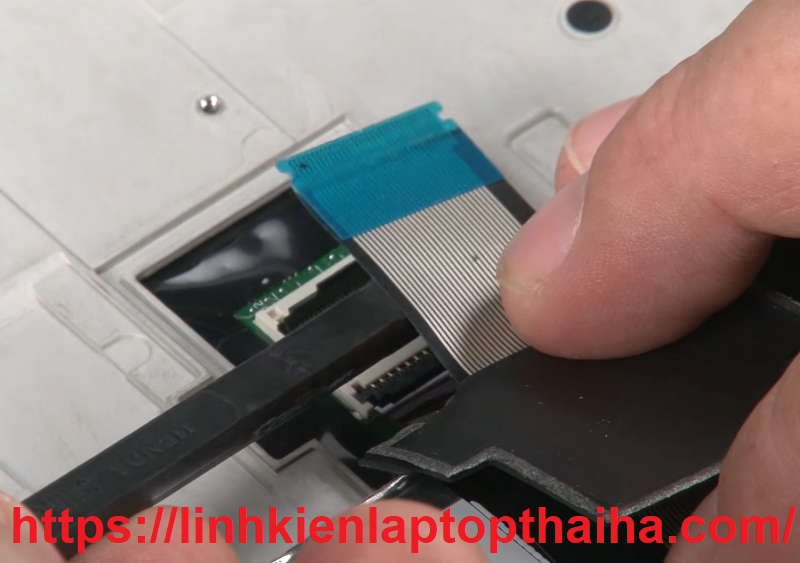 Bước 7: Sau khi gỡ bỏ bàn phím laptop cũ ra ta thay vào bằng bàn phím laptop mới đã chuẩn bị trước đó, gắn lại cáp bàn phím và cáp LED vào bo mạch chủ.