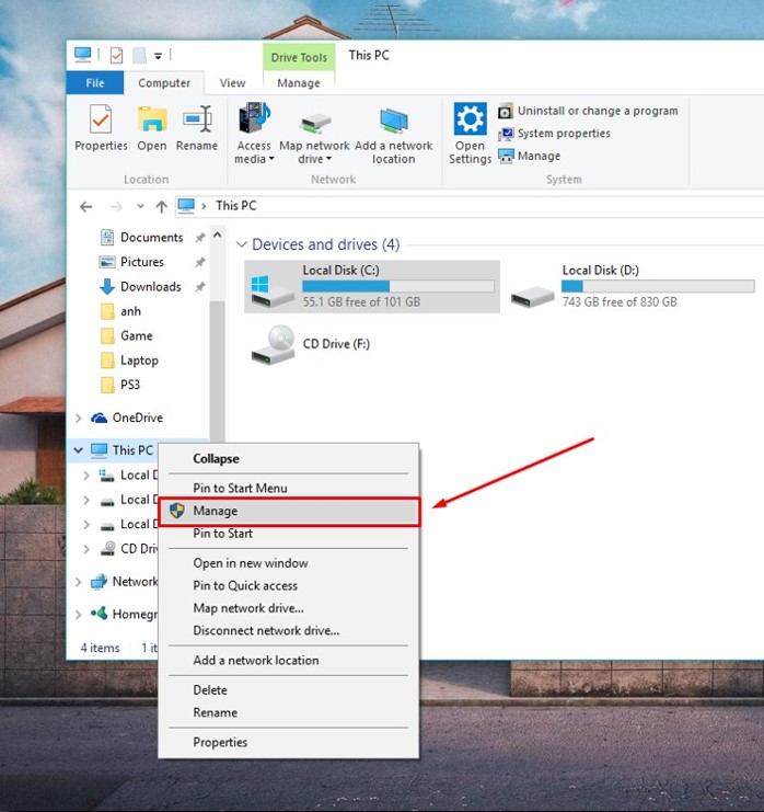 Click chuột phải vào biểu tượng Computer, chọn Manager.