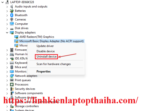 2. Nhấp vào nút thả xuống đối với Display adapters . Nhấp chuột phải vào trình điều khiển đồ họa và chọn Uninstall device từ trình đơn thả xuống.