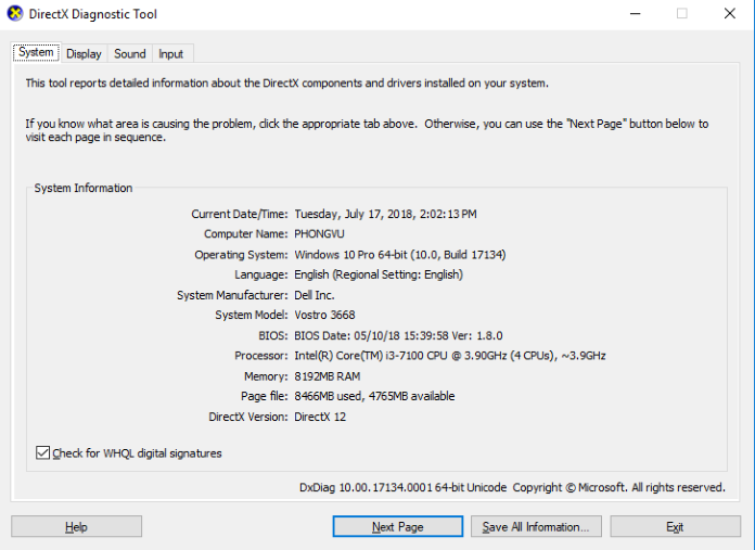 Cách 1: Kiểm tra bằng lệnh dxdiag