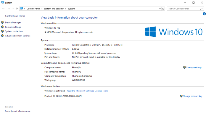 Cách làm này chúng ta sẽ biết được thông tin về hệ điều hành, thông số CPU, RAM, tình trạng kích hoạt của Windows, tên người dùng, tên máy tính và một số thiết lập hệ thống khác bên phía tay trái:
