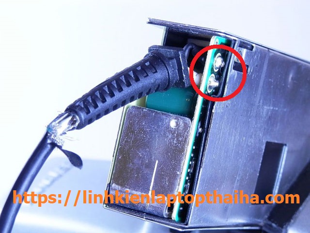 Khi mở thùng máy ra, bạn sẽ thấy đầu ra của cục hàn ghim trên bo mạch giống như mép ngoài như hình, bạn chỉ việc dùng mỏ hàn nối 2 đầu này để rút phần dây bị đứt ra (nhớ đánh 2 đầu dây) dấu vị trí để hàn lại.