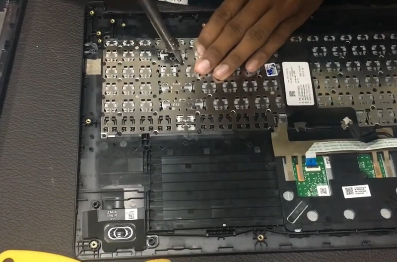 Bước 9: Tháo tấm kim loại sẽ thấy phần bàn phím laptop bị hỏng ta sẽ gỡ ra và thay vào bằng bàn phím mới khác.