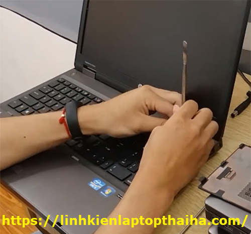 Bước 3: Mở ra laptop ra và sử dụng dụng cụ để cậy tháo hết các lẫy rồi nhấc bàn phím lên khỏi laptop.