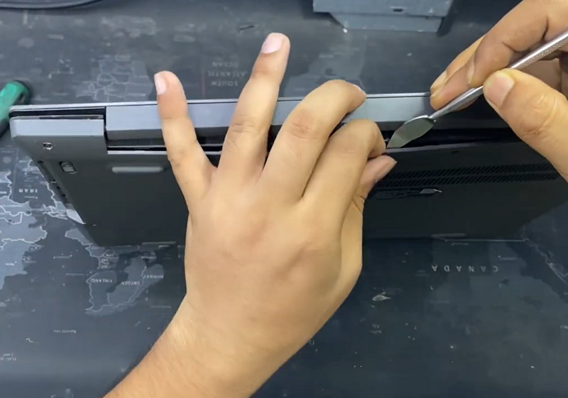 Bước 4: Sử dụng dụng cụ cậy mở chuyên dụng cậy mặt đáy ra khỏi laptop.